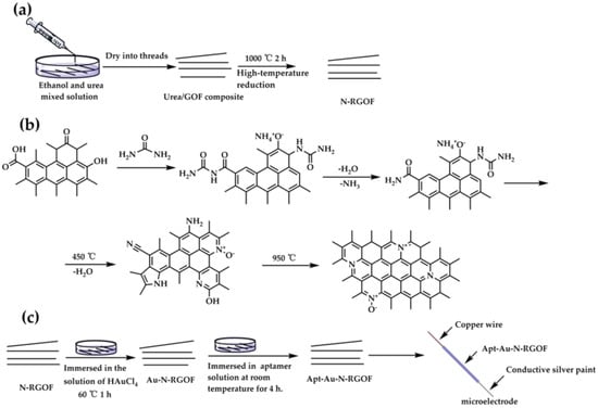The preparation of microelectrode is shown in Figure 1c. The N-RGOF was immersed in a 10 mM aqueous solution of HAuCl4 for 1 h, allowing Au/Au3+ nanoparticles to adsorb onto the defect sites on the graphene surface. Then, the resulting material was annealed at 60 °C for 1 h to produce Au-N-RGOF. The Au-N-RGOF was washed with 10 mM PBS (phosphate-buffered saline) and deionized water to remove any Au nanoparticles that had not been adsorbed onto the fiber surface []. The Au-N-RGOF was incubated in a 1 μM aptamer solution prepared in 10 mM PBS at room temperature for 4 h. During this incubation, the aptamers self-assembled and immobilized on the fiber surface by forming Au-S bonds. The fiber was washed three times with 10 mM PBS solution and deionized water to remove any aptamers that had non-specifically bound to the fiber. The final product, Apt-Au-N-RGOF, was obtained. Then, the Apt-Au-N-RGOF was loaded onto the copper wire through conductive silver paint to produce the microelectrode. This product was used for various biosensing applications where the specific recognition of the target molecules was required.