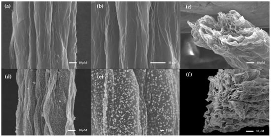 Representation SEM images of N-RGOF and Au-N-RGOF: (a) N-RGOF surface; (b) N-RGOF surface; (c) N-RGOF cross-section; (d) Au-N-RGOF surface; (e) Au-N-RGOF surface; (f) Au-N-RGOF cross-section.