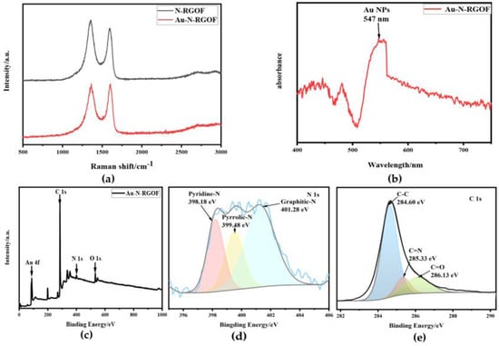 Raman spectra of N-RGOF, UV–Vis absorption spectra of Au-N-RGOF and Au-N-RGOF and XPS spectrum of Au-N-RGOF: (a) Raman spectra of N-RGOF and Au-N-RGOF; (b) UV–Visible absorption spectra of Au-N-RGOF; (c) XPS total spectra of Au-N-RGOF; (d) the corresponding high-resolution N 1s peak; (e) the corresponding high-resolution C 1s peak.