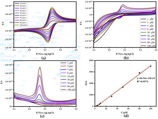 Electrochemical characterization of N-RGOF and detection of DA: (a) CV of N−RGOF in 0.5 M KCl with 5.0 mM K3Fe(CN)6 at different scan rates; (b) CV of N−RGOF in DA solution with different concentrations (1 μM, 3 μM, 5 μM, 8 μM, 10 μM, 30 μM, 50 μM, 80 μM, 100 μM); (c) DPVs of N−RGOF in DA solution with different concentrations; (d) linear relationship between DA concentration and DPV peak current.