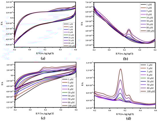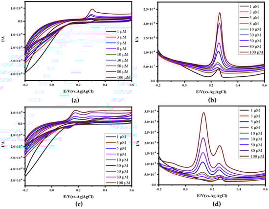 Electrochemical characterization of Apt−Au−N−RGOF in UA solution or mixture solution of UA and DA: (a) CV of Apt−Au−N−RGOF in UA solutions with different concentrations (1 μM, 3 μM, 5 μM, 8 μM, 10 μM, 30 μM, 50 μM, 80 μM, 100 μM); (b) DPV of Apt−Au−N−RGOF in UA solutions with different concentrations; (c) CV of Apt−Au−N−RGOF in mixed solution with different concentrations of DA and UA; (d) DPV of Apt−Au−N−RGOF in mixed solution with different concentrations of DA and UA.