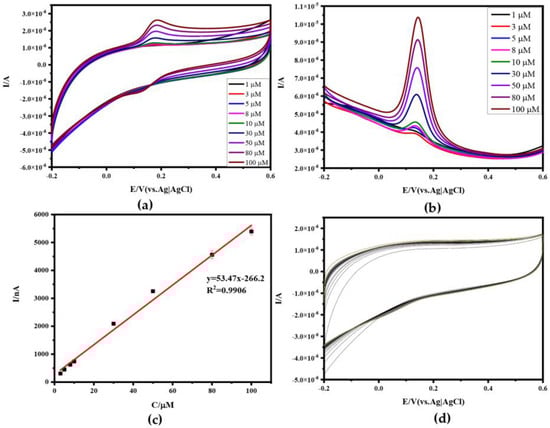 Electrochemical characterization of Apt−Au−N−RGOF in DA solution and 100 times CV cycles of RGOF in blank 0.1 M PBS solution: (a) CV of Apt−Au−N−RGOF in DA solution with different concentrations (1 μM, 3 μM, 5 μM, 8 μM, 10 μM, 30 μM, 50 μM, 80 μM, 100 μM); (b) DPV of Apt−Au−N−RGOF in DA solution with different concentrations; (c) linear relationship between different DA concentrations and DPV peak current; (d) RGOF 100 CV cycles in blank 0.1 M PBS solution.