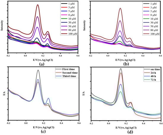 Selectivity, reproducibility, and stability: (a) DPV of Au−N−RGOF in a mixture solution of UA and DA with different concentrations (1 μM, 3 μM, 5 μM, 8 μM, 10 μM, 30 μM, 50 μM, 80 μM, 100 μM); (b) DPV of Apt−Au−N−RGOF in a mixture solution of UA and DA with different concentrations (1 μM, 3 μM, 5 μM, 8 μM, 10 μM, 30 μM, 50 μM, 80 μM, 100 μM); (c) DPV of Apt−Au−N−RGOF in a mixed solution of DA and UA (50 μM) on the first, second, and third time in (d) DPV of Apt−Au−N−RGOF in a mixed solution of DA and UA (80 μM) at different times (on time, 24 h, 48 h, 72 h).