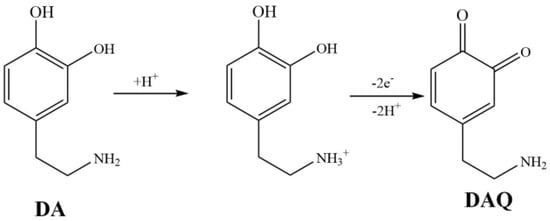 Among the techniques used for detecting low concentrations of DA, electrochemical analysis stands out for its high sensitivity, fast response time, practicality, low cost, and ease of operation []. This can be attributed to the flexible design of electrode materials and the easy oxidation characteristics of the phenolic hydroxyl functional groups in DA []. The oxidation mechanism of dopamine involves a two-electron and two-proton transfer process where dopamine is oxidized to form dopamine quinone (DAQ). As the electrode accepts electrons from the oxidized dopamine molecules, it generates a Faradaic current signal that can be measured [].
