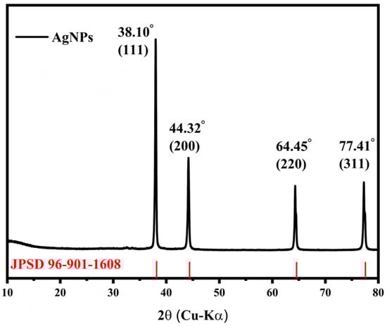 The crystal structure analysis of the biosynthesized AgNPs was carried out using the X-ray diffraction (XRD) technique (Figure 1). The resulting XRD diffractogram demonstrates the presence of four distinct peaks located at diffraction angles 2θ of 38.10°, 44.32°, 64.45°, and 77.41°, which can be attributed to the crystal planes (111), (200), (220), and (311), respectively. This correlation is supported by the Crystallography Open Database (COD), entry number JCPDS 96-901-1608.