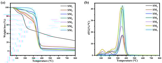 The second exothermic peak is located at 240 °C, similar to the temperature of the oxidative degradation of polymers [48,49]. As for SM7 (pure PEG), its thermogram presents a single endothermic peak at a low temperature of 74 °C, corresponding to the polymer’s melting temperature [50]. Additionally, for all other suspension matrices (SM2–SM6), two peaks are observed: an endothermic peak similar to the PEG melting temperature, shifting to lower temperature values as the PEG content in the matrices varies, resulting in a reduction in peak intensity. This transition results in a decrease in peak intensity, which can be attributed to the integration of PEG into the Na–alginate system, disrupting the crystalline structure of PEG. Similarly, the second endothermic peak of Na–alginate, resembling the melting temperature, becomes narrower due to interactions between the alcohol functional groups of Na–alginate and the ether groups of PEG. Furthermore, the exothermic peak of Na–alginate is eliminated, allowing us to conclude that the interaction between the carboxyl groups and ether groups of PEG is strong.