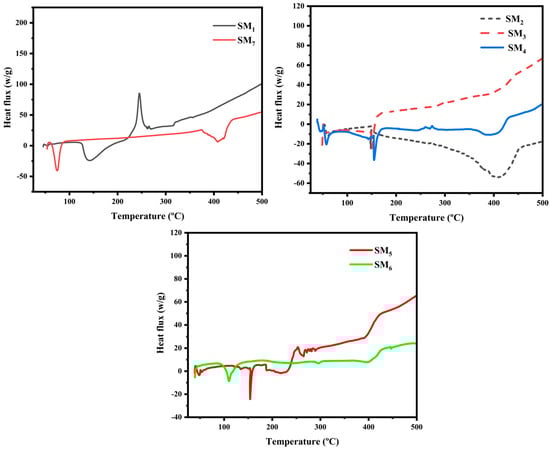 The SM1, composed of pure Na–alginate, exhibits a distinctive thermal profile characterized by two distinguishable peaks. The first endothermic peak is observed at 142 °C, corresponding to the melting temperature and closely resembling the water loss region observed in thermogravimetric analysis (TGA). Na–alginate contains two hydroxyl groups and one carboxylate group that form strong inter- and intramolecular hydrogen bonding, which explains the high value and broad melting peak (Tm).