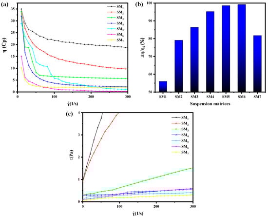 (a) Viscosity of suspension matrices at shear rates ranging from zero to 300 s−1. (b) Loss rate of suspension matrices, and (c) shear stress curves of suspension matrices at shear rates ranging from zero to 300 s−1.
