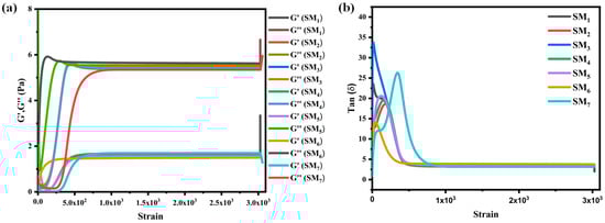 Oscillatory rheological tests were also conducted on the suspension matrices to determine the storage (G′) and loss (G″) rheological moduli. Figure 5a displays the G′ and G″ curves of the matrices as a function of deformation. All samples exhibited G″ > G′, indicating their viscoelastic liquid properties [40].