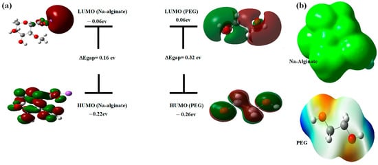 An analysis of the frontier molecular orbitals was conducted to provide a deeper understanding of the electronic properties within the structures of the Na–alginate and PEG. Isosurfaces representing the highest occupied molecular orbitals (HOMOs) and the lowest unoccupied molecular orbitals (LUMOs) are depicted in Figure 6a. A higher energy difference between HOMO and LUMO orbitals (Egap) generally indicates that the molecule tends to be stable and resistant to intramolecular interactions. This suggests that the electrons are strongly localized in specific orbitals, limiting their interactions with other surrounding molecules [56,57]. The energy values of the HOMO (Na–alginate) and LUMO (Na–alginate) orbitals, as well as the HOMO (PEG) and LUMO (PEG) orbitals, are −1.96 eV, −5.20 eV, −0.26 eV, and 0.06 eV, respectively. The energy gap between HOMO and LUMO was determined to be 3.24 eV and 0.32 eV for Na–alginate and PEG, respectively.