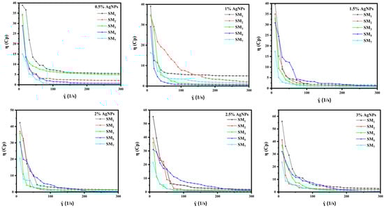Achieving a suspension of AgNPs in a carrier polymer matrix, with suitable rheological properties, is a critical task in the formulation of printable conductive inks. In this section, the rheological behaviors of the conductive inks were examined. Five specific suspension matrices (SM1, SM2, SM3, SM5, and SM7) have been carefully selected as carrier polymer matrices. Within these matrices, varying concentrations of AgNPs, ranging from 0.5 %wt to 3 %wt, are systematically dispersed. As can be seen in Figure 7, all five formulations exhibited thixotropic properties, which means they exhibited shear thinning and non-Newtonian characteristics. According to our findings, SM1 and SM2 exhibited higher viscosities values. However, incorporating AgNPs into these matrices significantly increased the viscosity, which affected their suitability for inkjet printing technology. This increased viscosity can be attributed to several factors: