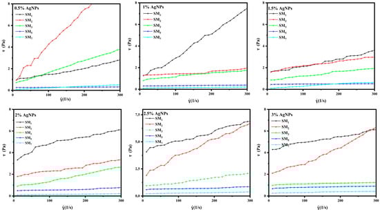 Figure 8 presents the shear stress as a function of the shear rate for conductive inks. Based on the curves, it is clear that the initial value of shear stress is non-zero, indicating that our inks follow the Herschel–Bulkley rheological model. Additionally, it was observed that the yield strength of the inks increases with an increase in the AgNPs amount. This is because AgNPs create rigid networks as a result of Van der Waals interactions between them and the suspension matrix. Regarding SM1, the addition of AgNPs significantly increases its yield strength. This is because the Na–alginate chains, along with the nanoparticles, form a system that is difficult to break down. For the other formulations, lower shear stresses are observed compared to SM1. This can be attributed to the presence of PEG, which reduces interactions between Na–alginate chains and AgNPs, helping to reduce the shear stresses.