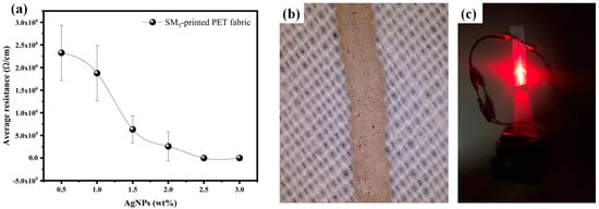 It is well known that viscosity and rheological appearance are crucial properties for classifying inks into two categories: low-viscosity inks and high-viscosity ones. Low-viscosity inks are generally used for inkjet printing, with a viscosity ranging between 13 and 30 mPa.s [61,62]. From the rheological results, it is clear that despite the addition of 3 wt% AgNPs to SM5, its viscosity value remains within the recommended range for inkjet ink, making it the most suitable ink for inkjet printing. Based on this finding, we delved into the electrical characteristics of the printed patterns made using this chosen formulation with varying amounts of AgNPs. The printing was carried out using a syringe deposition system. This technique allows rapid prototyping by creating electronic patterns directly on textiles. The accuracy of the printed line’s thickness was maintained at 0.1 mm, measured using a highly reliable micrometric screw gauge. After the printing process, we conducted precise electrical assessments. Through a systematic measurement of resistance relative to AgNP concentration, a discernible relationship between the printed pattern’s resistance and the AgNPs weight percentage was established, as presented in Figure 10a. Fabrics printed with 0.5 wt% AgNPs exhibited non-conductivity, as the insufficient AgNP content prevented the formation of an effective conductive path. However, an increase in AgNP content from 0.5 wt% to 3 wt% induced a substantial decrease in resistance, from 2.325 MΩ/cm to 0.008 Ω/cm. This decreasing effect is mainly due to the increase in AgNP content, which enhances the formation of an efficacious conductive pathway. The lowest value is sufficient to switch on an LED connected to the printed PU-coated PET.