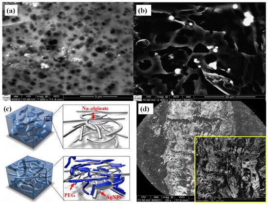 For SM5 formed from Na–alginate doped with PEG, it is evident from the SEM image (Figure 10b) that the morphology reveals disorganization due to the incorporation of PEG into the Na–alginate matrix, leading to larger pores [63]. This observation allowed us to justify the significant difference in viscosity between SM1 and SM5, consistent with the results of the rheological measurement. The increase in pore size results in a reduction in viscosity, which improves molecular mobility within the SM5 matrix and potentially facilitates ink flow. This reduction in viscosity makes it highly compatible with inkjet printing, especially when optimized rheological parameters are taken into account. As a result, the SM5 formulation has better flow characteristics through the syringe needle, resembling a printhead.