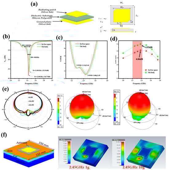 The SAR value must remain below 1.6 W/kg per gram of tissue as per the US standard and below 2 W/kg per 10 g of tissue as per the EU standard [4]. We conducted simulations to determine the SAR value at a frequency of 2.45 GHz. Furthermore, Figure 12f illustrates the three-dimensional SAR distribution for the proposed antenna design. The maximum SAR values according to the 1 g and 10 g standards are 0.397 W/kg and 0.162 W/kg, respectively, both falling within FCC’s permissible limits [71,72].