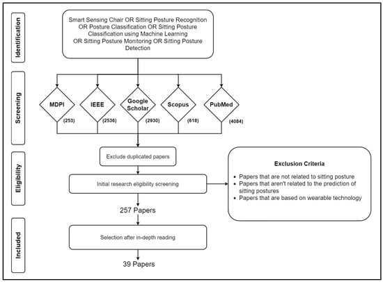 The initial screening was based on the relevance of the titles and abstracts to the research questions. Studies published within the last 20 years were considered, applying the exclusion criteria to ensure that only relevant research studies were included in this comprehensive review. The initial database search yielded 253 papers from MDPI, 2536 from IEEE, 2930 from Google Scholar, 618 from Scopus, and 4084 from PubMed. To refine this selection and isolate relevant articles, specific conditions were applied to exclude studies that did not meet our criteria, including the following: 1. Papers unrelated to sitting posture, 2. Papers not concerning the prediction of sitting postures, and 3. Papers focused on wearable technology. The rigorous selection process, depicted in Figure 1, ultimately identified a total of 39 relevant papers.
