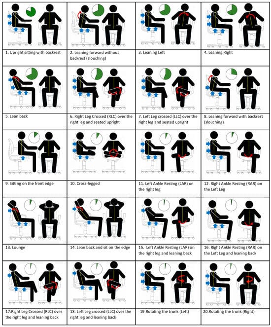 The concept of an “ideal” sitting posture is inherently subjective, reflecting significant variation across diverse groups. Particularly for individuals with permanent mobility impairments or those who use wheelchairs, the parameters defining a comfortable sitting posture are distinctly unique. While the conventional wisdom among healthcare professionals advocates for an upright lordotic spinal position, the inherent variability in spinal anatomy across individuals challenges the notion of a one-size-fits-all “correct” posture [62]. Biomechanical research has shed light on the consequences of various sitting positions on spinal alignment and muscle engagement, emphasizing the musculoskeletal stress induced by inadequate postures [63]. These investigations reveal that extended periods of sitting, especially in a slumped position, intensify the symptoms of musculoskeletal disorders and are a contributing factor to lower back pain. Moreover, recommendations consistently suggest minimizing prolonged sitting durations, regardless of whether the posture is upright or slouched, to mitigate potential health risks. Korakakis et al. [63] underscored the absence of conclusive medical evidence associating any particular sitting posture with enhanced health benefits, further complicating the pursuit of an optimal sitting strategy. Figure 2 presents 20 sitting postures detected by smart sensing chair systems as reported in the literature, with the relative prevalence of each posture depicted through a pie chart. This pie chart quantifies the percentage of review papers that investigated each specific posture, ranking these postures from the most to the least frequently detected by such systems. Blue arrows highlight the primary pressure points at the interface between the seat and the occupant, while red arrows delineate the direction of adjustments necessary for adopting each specific posture. The most popular sitting postures detected by the smart sensing chairs included the following: 1. Upright sitting with backrest, 2. Leaning forward without backrest (slouching), 3. Leaning left, 4. Leaning right, and 5. Leaning back, reported by the majority of studies.