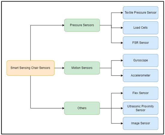 Taxonomy graph of sensors used in smart sensing chair systems.
