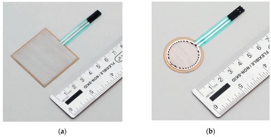 Examples of FSR sensors. (a) Square-shaped FSR sensor (FSR01CE) [67]. (b) Circle-shaped FSR sensor (FSR03CE) [67].