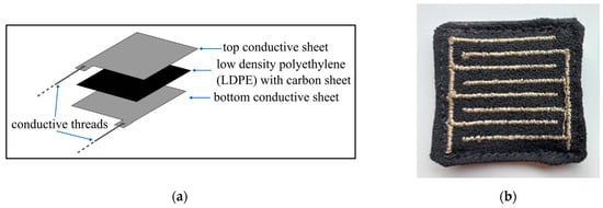 A textile-based pressure sensor is generally composed of a soft fabric-based material that consists of a conductive thread pattern placed over a dielectric material that serves as a substrate between the threads [70]. Figure 5a visualizes an example of how each layer within the textile pressure sensor is structured within. One of the main advantages seen with textile force sensors is the fact that they can be very durable and seamlessly integrate with garments, making them non-obstructive and comfortable for the end user. Thus, this sensor tends to be more popular among wearable technologies.