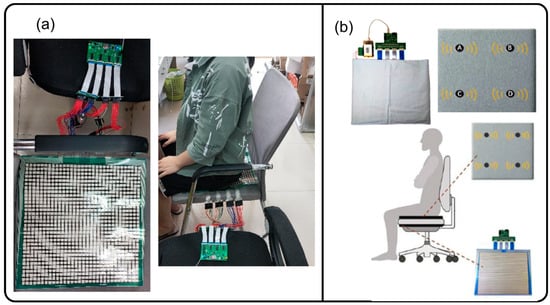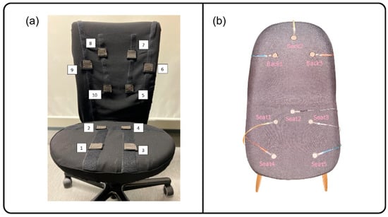 Research studies using multiple pressure sensors placed around a chair. (a) Chair fitted with 10 textile pressure sensors. Reproduced with permission [26]. (b) Eight FSR sensors placed around a chair, five sensors placed on a sitting cushion, and three sensors added to a backrest. Reproduced with permission [28].