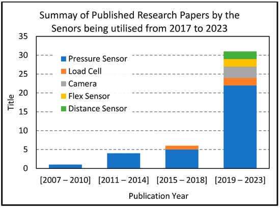 Number of research papers published on smart sensing chair technology along with the sensor being used from 2007 to 2023.
