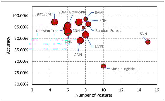 While most studies utilized a singular type of sensor for posture detection, there were only a few studies that involved multiple sensor types in their proposed smart chair system. Jeong and Park [35] utilized six pressure sensors (placed on the seating cushion) along with six Infrared Reflective Distance Sensors (placed on the backrest). By using the K-Nearest Network (KNN), they were able to classify 11 different sitting postures while achieving an accuracy of 92%, compared to 59% while using only pressure sensors. This study highlighted one of the main limitations seen with other smart sensing systems, where pressure sensors alone are incapable of measuring the spinal trunk angle, which is yet another important factor in maintaining a proper sitting posture. Similarly, Cho et al. [54] used 16 pressure sensors placed on the sitting cushion along with two ultrasonic sensors placed at the neck support region. With this configuration, they were able to achieve 96% accuracy using the Lower-Balance Check Network (LBCNet) to classify 15 sitting postures.