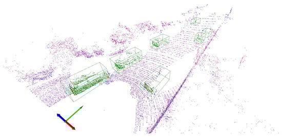 Let us define a scene S as a 3D cloud point instance produced by a single sweep of a LiDAR sensor. In this paper, we will consider LiDAR sensors that record the 3D spatial coordinates , , and and the reflected intensity value of each scene point . A scene is therefore a set of N points , where . In the context of 3D object detection, an annotated scene is defined as a scene S that is equipped with a label Y that includes the location, orientation, and class of every object in S. The location and orientation of an object can be described using a 3D bounding box, and examples of object classes in a typical urban scene include car and pedestrian classes. Figure 1 shows an example of an urban annotated scene consisting of a 3D point cloud produced by a LiDAR sensor.