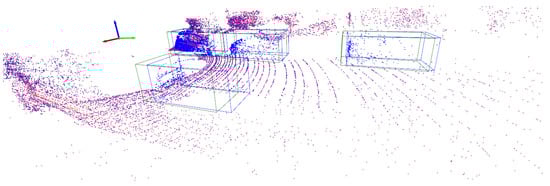 where computes the volume of its 3D argument, ∩ is the intersection between two 3D objects, and ∪ is their union. IoU values close to one indicate that there is a high overlap between bounding boxes B and , whereas IoU values close to zero indicate limited overlap. Object matching occurs when the IoU value is above a predefined threshold . In addition, if several bounding boxes in overlap with the same ground bounding box in Y, the one with the highest IoU value is selected. This process, which is known as non-max suppression, is used to eliminate potential duplicate detections. Figure 2 shows the bounding boxes in a predicted label produced by a pipeline l for a subset of points of the scene in Figure 1. The bounding boxes of the objects in Y are also shown, demonstrating that the bounding box of every object in Y overlaps with the bounding box of one object in . In one case, the bounding box of one of the objects in Y overlaps with the bounding boxes of two objects in . If both predicted bounding boxes are matched to the true object, non-max suppression is triggered to select the predicted object with the highest IoU value.