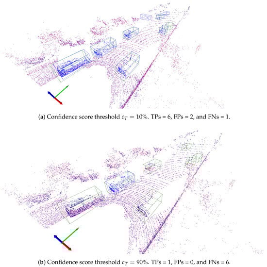 Once the matching process is completed, the concepts of true positive (TP), false positive (FP), and false negative (FN) are computed for every scene . These concepts are defined as follows. An object in that matches one object in Y is a TP. In contrast, an object in that does not match any object in Y is a FP. Finally, an FN is any object in Y that is not matched by an object in . It is worth noting that the values TP, FP, and FN depend on the confidence threshold . In general, low values will result in many FPs and few FNs, and vice versa. This is illustrated in Figure 3a,b for the given scene instance, which shows, alongside the bounding boxes of the true objects, the bounding boxes of the objects predicted by a pipeline l using two different confidence thresholds, namely, and . For , the prediction pipeline produces 6 TPs, 2 FPs, and 1 FN. In contrast, using the confidence threshold leads to 1 TP, 0 FPs, and 6 FNs.
