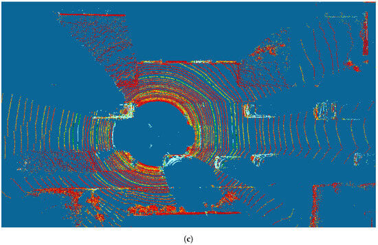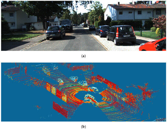 In the case of 3D scenes consisting of objects of multiple classes, we decompose the problem into several detection problems by considering each class separately. For instance, in a traffic scene consisting of cars, pedestrians, and bicycles, we would formulate three separate problems focusing on car detection, pedestrian detection, and cycle detection, respectively. Finally, BEV approaches provide an alternative to directly detecting objects in a 3D point cloud. By projecting 3D point clouds onto a 2D plane corresponding to a top-down view, BEV allows the problem of 3D detection to be recast as 2D detection. Figure 4 illustrates the principle of BEV. A 2D camera image and 3D LiDAR point cloud captured during the same urban traffic scene are shown in Figure 4a,b, respectively. The BEV point cloud resulting from projecting the 3D LiDAR point cloud onto a top-down view plane is shown in Figure 4c. Objects in the original 3D point cloud scene also appear in the BEV point cloud, which allows us to recast a 3D-object-detection-and-localization problem as a BEV 2D-object-detection-and-localization problem.