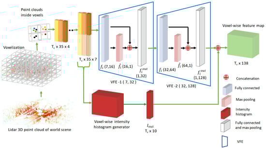 Architecture of the proposed intensity-aware voxel encoder. After voxelization, a scene is represented as a tensor with dimensions of , where , and , , and are the number of voxels along the depth, height, and width dimensions of the scene. After augmentation, a tensor whose dimensions are is generated and then processed via cascaded encoders VFE-1 and VFE-2. A voxel-wise intensity histogram , whose dimensions are , is concatenated to the output of VFE-2, whose dimensions are , to produce the final voxel-wise feature map.