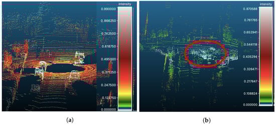Examples of 3D LiDAR point cloud scenes where the reflected intensity has been-color coded. (a) KITTKI instance taken in clear weather conditions. (b) CADC instance taken during adverse weather conditions, where the highlighted region (red eclipse) shows low intensity values.
