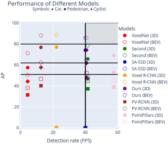 Visualisation in the AP × detection rate plane of the performance of the models shown in Table 6. AP values are obtained separately for ’Car’, ’Pedestrian’ and ’Cyclist’ objects, and for 3D and BEV detection modalities. Detection rates were computed using one single NVIDIA RTX 3080 GPU.