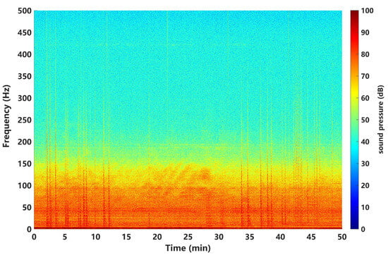 Time–frequency map of typical ocean ambient noise measured in the South China Sea (50 min).