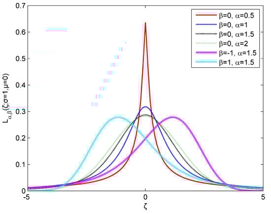 where denotes the stability index that describes an asymptotic power law of the Lévy distribution: the smaller the , the stronger the impulsive characteristics. is the asymmetry parameter, which represents the distributed left deviation, right deviation, and symmetry for positive, negative, and zero, respectively. Moreover, is the mean parameter that represents the center of distribution; is the scale parameter used to measure the degree of deviation from the mean. represents the Gaussian distribution and represents the well-known Cauchy distribution. The probability density functions for Lévy distribution with different stability indexes and asymmetry parameters are shown in Figure 2, which can be considered a generalized noise model for real ocean ambient noise. In this paper, the Janicki–Weron algorithm is employed to generate the Lévy distribution sequence [48]. Since, for , there is no finite variance in thhe noise, the noise power can be obtained by the following: