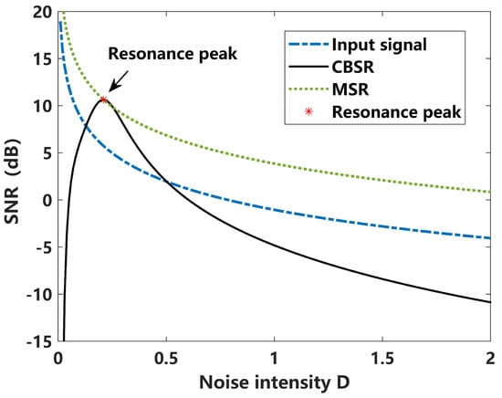 In this way, the weak signal that is hidden against the heavy background can be enhanced and detected. A comparison of output SNR curves corresponding to different input noise intensities is given in Figure 3. For a deterministic, static, nonlinear system of CBSR with fixed system parameters, the curve of the output SNR varied with noise intensity D, forming a “resonance” curve, where there exists an optimal noise intensity value that can achieve the maximum . For the curve corresponding to the MSR, it can be seen that the system parameters can be optimized under any conditions.
