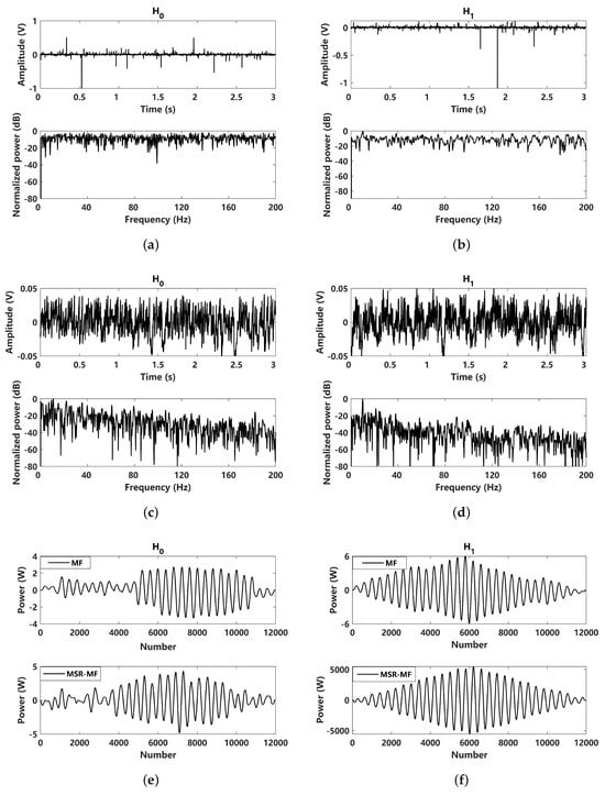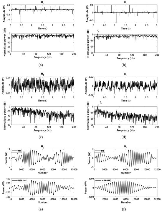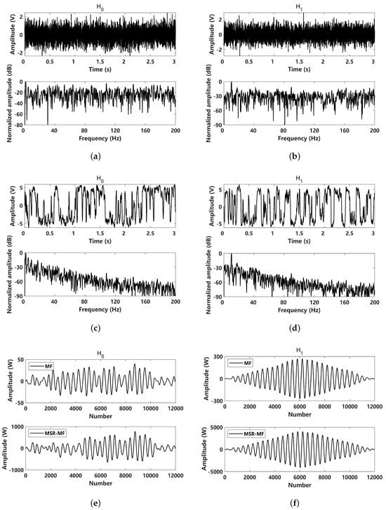 Comparison of input and MSR output results under and hypotheses (): (a) received signal under the hypothesis (); (b) received signal under the hypothesis (); (c) MSR output signal under the hypothesis (); (d) MSR output signal under the hypothesis (); (e) filtering processes, matched to the received signal and the corresponding MSR output signal under the hypothesis (); (f) filtering processes, matched to the received signal and the corresponding MSR output signal under the hypothesis ().