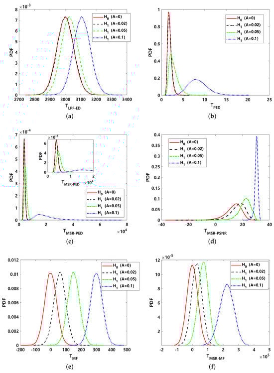 Comparison of probability density function (PDF) of different test statistics under Gaussian noise (): (a) energy detector with low pass filter for received signal (); (b) PED for received signal (); (c) PED for MSR output signal (); (d) PSNR for MSR output signal (); (e) matched filtering for received signal (); (f) matched filtering for MSR output signal ().