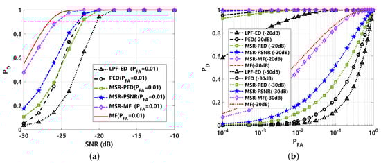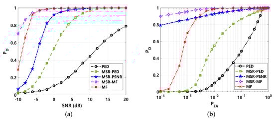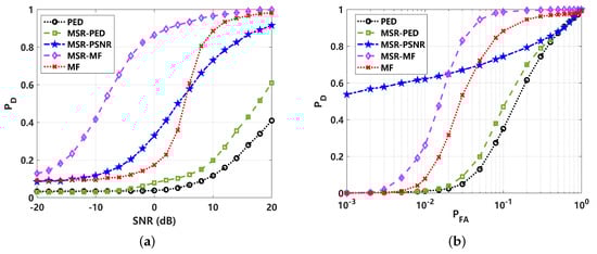 To analyze the effect on the detection performance of the different test statistics of detectors, a comparison of the probability density function (PDF) with statistics is presented in Figure 6. The test statistics include an energy detector with a low pass filter for received signal , PED for received signal , PED for MSR output signal , PSNR for MSR output signal , matched filter for received signal , and matched filter for MSR output signal . The curve of the hypothesis and hypothesis with different signal amplitudes can clearly reveal their detection performance, where the should be inferior in all results. This is further revealed in Figure 7. In comparison with Figure 6b,c, corresponding to and , it can be seen that the performance is close. According to the detection curve in Figure 7, PED is better under a higher SNR, while MSR-PED is superior under lower-SNR conditions. For real applications, the detection probability generally requires that ; hence, the PED may be a better choice than MSR-PED in this instance. The PDF of the proposed is shown in Figure 6d. Intuitively, it can be seen that the is superior to the PDF corresponding to the , and the hypothesis is more likely to be separated. This indicates that utilizing can lead to a better detection performance, and this result is further validated, as shown in Figure 7. This means that the proposed MSR-PSNR is efficient in improving the detection performance, especially under low-SNR conditions. By setting the detection probability at = 0.8, the minimum detectable SNR of MSR-PSNR can reach −24 dB. The ROC curves corresponding to −20 dB and −30 dB are given in Figure 7b. It can be seen that MSR-PSNR is superior with a different , especially in improving the detection performance under low-false-alarm-rate conditions. For MSR-MF and MF detectors, it can be seen that MF is superior. This indicates that MSR processing cannot break through the constraints of the optimal detection theory under Gaussian noise.