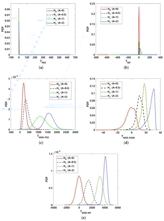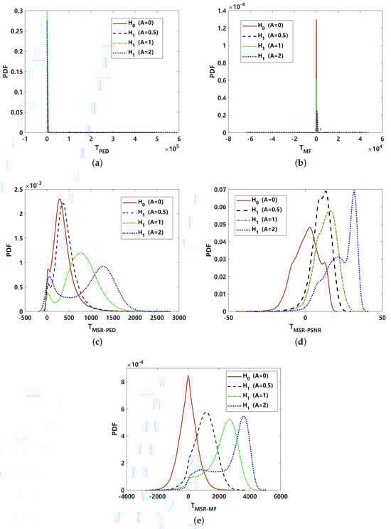 Comparison of probability density function (PDF) of different test statistics under non-Gaussian impulsive noise (): (a) PED for received signal (); (b) PED for MSR output signal (); (c) PSNR for MSR output signal (); (d) matched filtering for received signal (); (e) matched filtering for MSR output signal ().