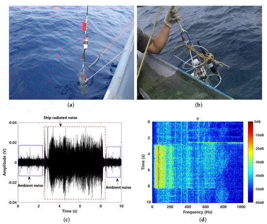 Sea experiment: (a) the deployment of low-frequency broadband sound source UW350; (b) the receiver with an ocean sonics hydrophone; (c) the received signal in the time domain; (d) the received signal in the time–frequency domain (received at 500 m distance).