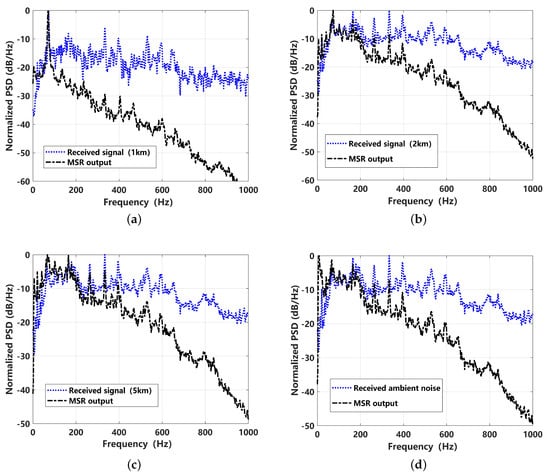 Normalized power spectral density (PSD) comparison of received signal and the corresponding MSR output for different distances: (a) 1 km; (b) 2 km; (c) 5 km; (d) ambient noise.