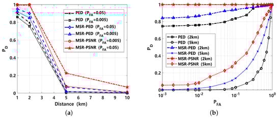 Detection performance comparison for ship-radiated signals: (a) detection probability () curve, varied with distance; (b) receiver operating curve (ROC).