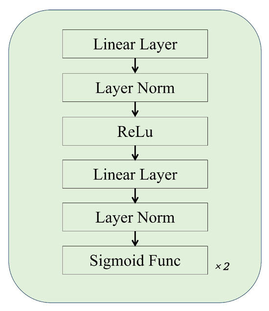 Gate Blocks—The gate blocks classify the previously Task-shared representations. Through three branches, the predicted values of three groups of physiological signals are finally obtained. Our gate block is shown in Figure 2. The previous feature vector is first projected to a linear layer, following which layer normalization is performed to reduce the possibility of gradient explosion. Then, the ReLU function is used to increase nonlinear features. Through a linear layer and layer normalization again, the model better learns and fuses features at different levels. Finally, through two sigmoid functions, and (denoting the output of each gate) are obtained. Then, they are multiplied by the Task-shared representation r. In this way, we finally obtain the task-specific features . Finally, each is input into the corresponding estimation head to obtain the predicted physiological signals .