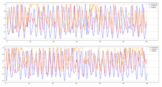 We presents the HR measurement results in Table 2, Table 3 and Table 4. Furthermore, the BVP signals output from our proposal and the SOTA baseline (i.e., PhysMLE [47]) are visualized and compared to the ground-truth in Figure 3. According to the results on the PURE dataset, the deep learning-based rPPG methods were superior to the traditional rPPG single-task methods, as the traditional methods are based on stricter assumptions and had not been trained with a large amount of data [62]. Deep learning-based methods can automatically learn features from large-scale data, and their performance usually increases with an increasing volume of data. Therefore, under the condition of large-scale data, the effect of the traditional methods was not as good as that of the deep learning-based methods. In addition, deep learning methods can automatically learn the multi-level abstract features of data, while traditional methods often rely on artificially designed features [67], which requires significant prior knowledge and experience regarding the domain, and still may not be able to fully capture the complex patterns in the data. Therefore, in a changing environment, the effect of the traditional methods is not as good as that of the deep learning-based methods.