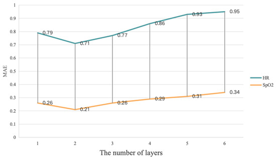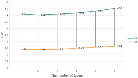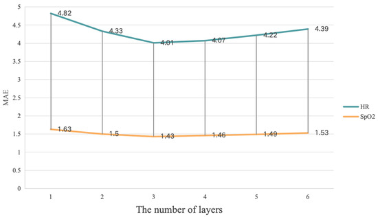 In Figure 4 and Figure 6, it can be seen that the MultiPhys blocks with 2 layers had the best HR, SpO2, and RR estimation performance while, in Figure 5, the MultiPhys blocks with 3 layers had the best HR and SpO2 estimation performance. The reason for this phenomenon may be that the VIPL-HR dataset, compared to the other two datasets, has more complex lighting conditions and head movements [71] and, so, learning more complex and abstract representations of features in more layers may result in better prediction performance. From the overall trend of our three figures, we can observe that, when N increases from 1 to 2 or 3, the MAE decreases while, when it gradually increases from 2 or 3, the MAE will gradually increase. This is because, as N increases, our MultiPhys blocks can automatically learn multi-level features from the original physiological data and construct more complex nonlinear functions, thereby better fitting the data. However, when N reaches 2 or 3 and continues to increase, it can cause the model to learn the noise and irrelevant features in the training data, thereby overfitting the training data, and there may also be cases of disappearance or explosion of the gradient, which makes the model difficult to train and reduces the performance of the model. In conclusion, in our experiment, we chose as the optimal number of layers for MultiPhys blocks.