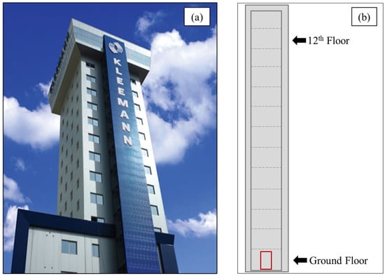 In this work, the DL-based SHM framework was developed and validated on a high-rise test tower structure, specifically designed for developing and testing elevator systems by Kleemann Lifts (Figure 1a). The tower is located in the industrial area of Kilkis, in Central Macedonia, Greece. The tower consists of a total of 13 floors, with the 13th floor being the control room, while only floors 1 (ground) to 12 are available for elevator testing (Figure 1b).