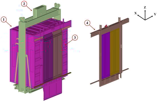 Experimental elevator and subsystems. Subsystems (1)–(3) denote the elevator cabin, chassis, and doors and subsystem (4) denotes the building floor door.