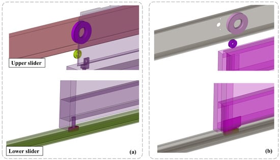 The experimental elevator system used in this work is shown in Figure 2. The cabin system can be subdivided into three major subsystems, namely, the elevator cabin (1), the chassis (2), and the cabin doors and frame (3). In this study, the sliding door mechanism at the building floors was also considered and thus, the floor door subsystem (4) is also included in the analysis. The cabin consists primarily of steel, with its electronics placed in a box on the outside of the cabin roof, where a suitable place is provided for securing the required DAQ equipment. The cabin doors operate through a sliding mechanism, moving through wheels, bearings, and sliders within the cabin’s guiding rails, as shown in Figure 3a. A similar mechanism is also present in the floor door subsystem, shown in Figure 3b.